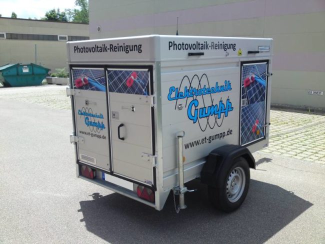 Wir konnten durch unseren Service und unsere hohe Qualität bei Material und Produkten die Firma Elektrotechnik Gumpp von uns überzeugen. Nach der Logoüberarbeitung sorgten wir nun für die fachgerechte und professionelle Beschriftung eines Spezialanhängers zur Photovoltaik-Reinigung.